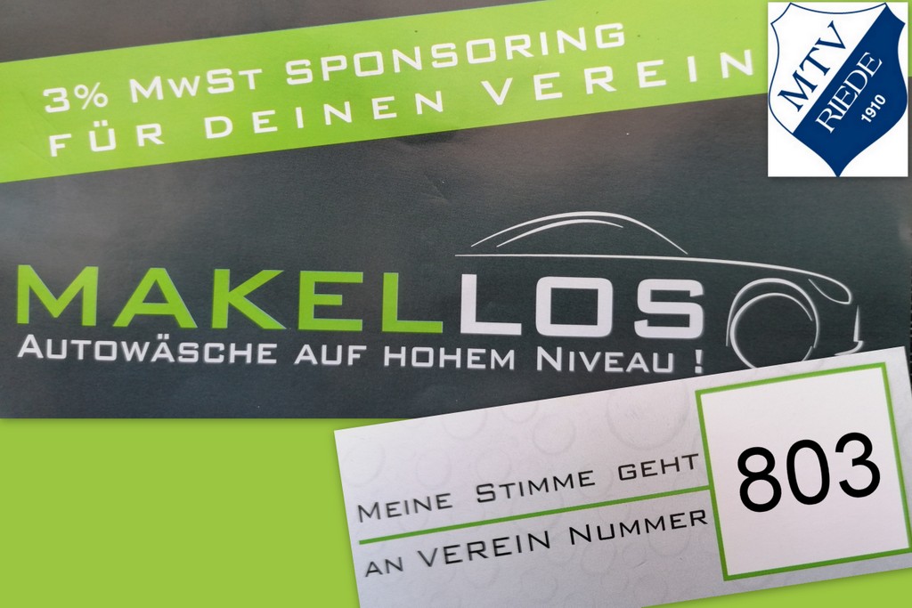 Der MTV Riede steht auf der MwSt.-Sponsoringliste bei der Waschanlage in Dreye Makellos. Jeder Kunde hat mit einer bezahlten Fahrzeugwäsche die Möglichkeit eine Stimme für seinen bzw. unseren Verein MTV Riede abzugeben. Die Stimmauszählung wird täglich aktuell bei Makellos vor Ort veröffentlichen oder