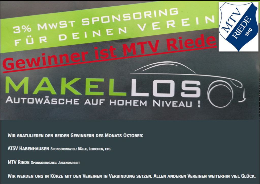 Der MTV Riede hat gewonnen! Die Autowaschanlage Makellos in Dreye veranstaltet ein MwSt.-Sponsering Wettbewerb bis Dezember. Bei jeder Autowäsche kann man ein Voting für einen Verein abgeben der sich beworben hat. Jeden Monat resultieren daraus immer 2 neue Gewinner. In diesem Monat Oktober hat der MTV Riede mit seiner Jugendarbeit es geschafft!